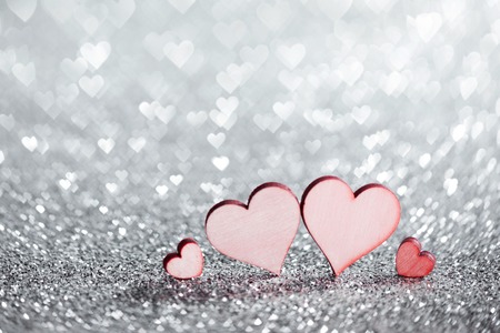 Four wooden hearts on silver glowing bokeh hearts background for Valentines day