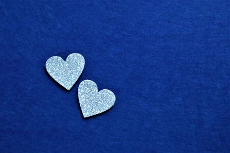 two silver hearts on classic blue background in trendy color of year 2020. Copy space.