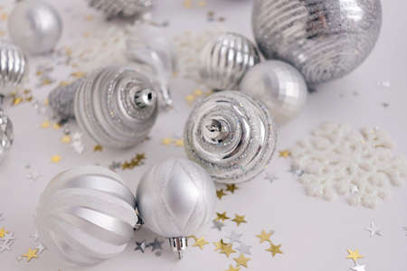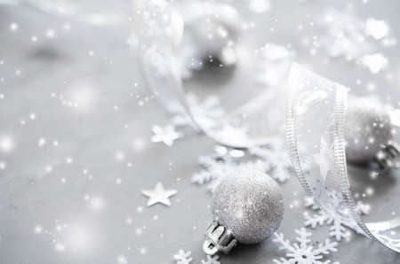Christmas and New Year background with silver and white christmas decorations.