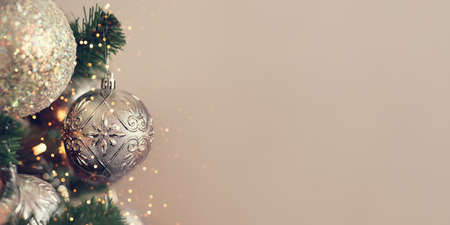 Happy new year and Merry Christmas. Background of Christmas silver elements on glitter silver background. Long format for web