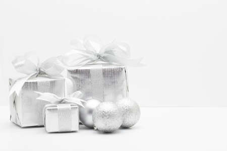 Christmas and New Year background with white gift boxes, silver balls and snowflakes