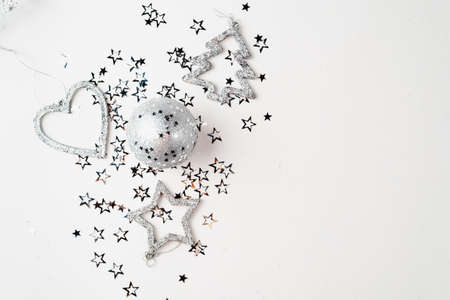 Christmas background with silver and white decorations. Flat lay, top view.