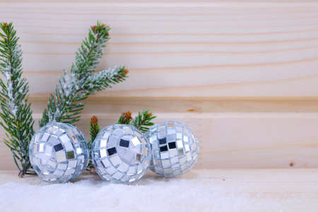 Three disco ball ornaments on a wooden surface decorated with a fir branch