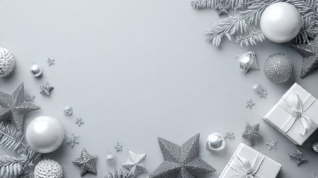 Christmas background with silver and white decorations on gray. Top view with copy space.