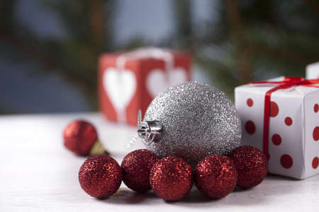 View of Christmas ornament and a silver wrapped gift box on a light background. Christmas gifts and decoration concept.