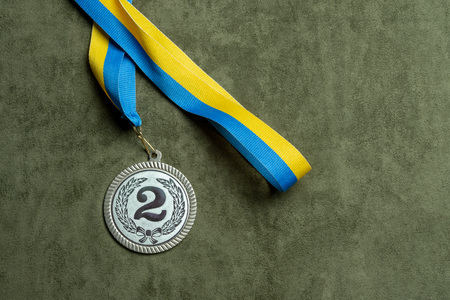 Silver medal for second place with a yellow and blue ribbon. copy-space