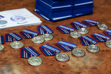 Moscow, Russia - March 27, 2019: medals of the Russian National Guard lie on the table. Medals awaiting delivery
