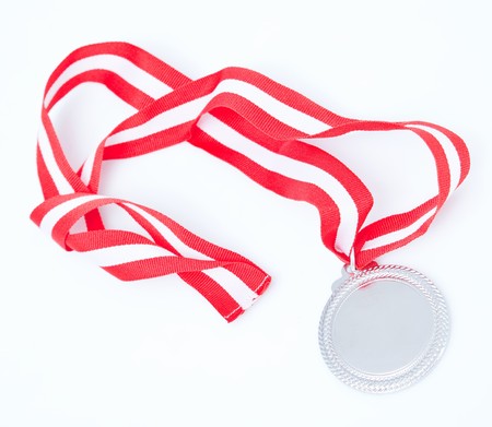Silver medal awarded for second place, hanging on a vibrant red ribbon.