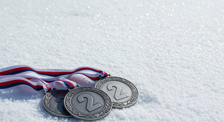 A close-up view captures three second-place silver medals with a colorful red, white, and blue ribbon resting on fresh, glistening snow under bright sunlight, offering ample copy space.