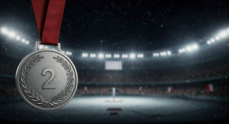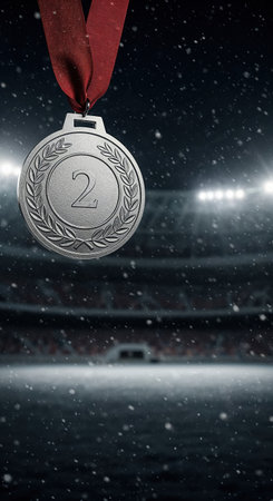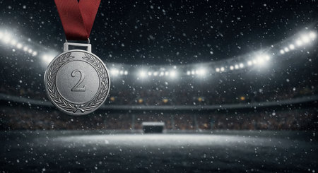 A detailed second-place silver medal on a vibrant red ribbon is suspended amidst falling snow at a brightly lit sports arena during a cold winter night, symbolizing achievement.