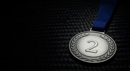 The detailed silver second-place award, featuring an engraved number and classic wreath, is dramatically lit on a dark, woven surface, offering ample copy space.