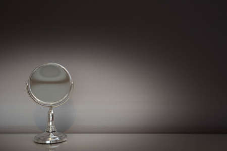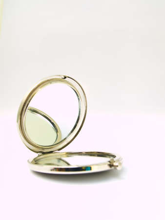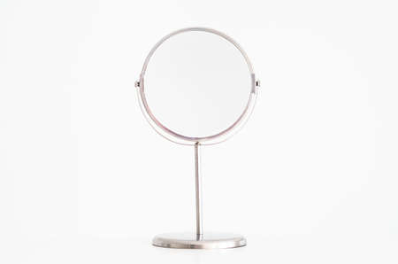 Single magnifying beauty mirro on stand isolated against pure white front view