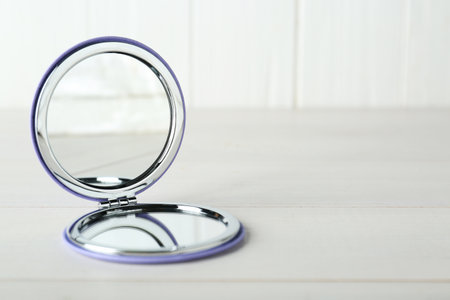 Stylish cosmetic pocket mirror on white wooden table. Space for text