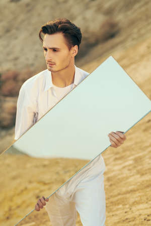 Fashion shot. Portrait of a romantic young man in white clothes posing in a desert with a mirror.