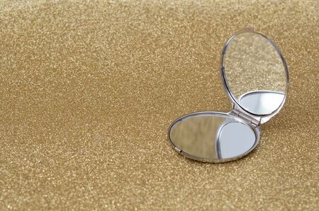 Make up mirror against black background, closeup view, copy space. Small pocket mirror round shape, double in shiny pink color