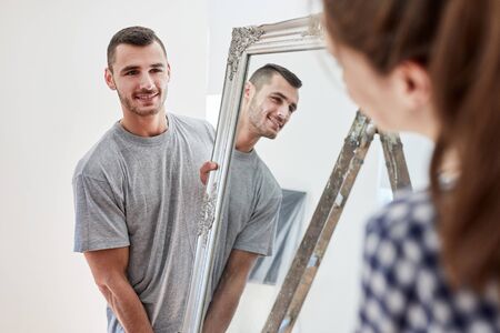 Narcissistic handsome young man admiring his reflection in the mirror in a show of self-absorption