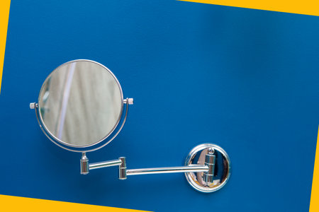 Round mirror against a blue and black wall. Space for text. The concept of emptiness. Copy space