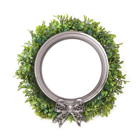 Silver frame with Christmas decorative green wreath isolated on a white background