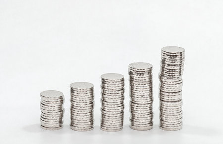 closeup silver coins stacks isolated on white background