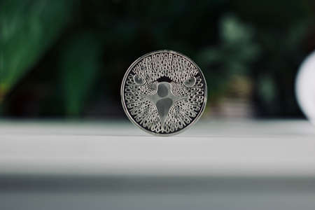 Digital currency physical metal silver monero coin. Monero closeup concept.
