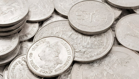 a stack of American twenty-five-cent coins, a close-up of American coins