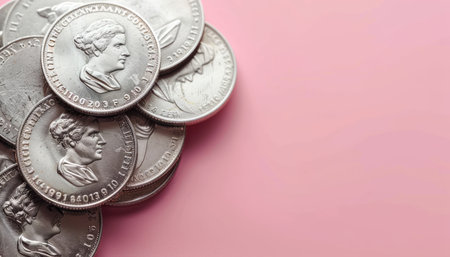 Collection of Silver Coins Piled on Pink Background Showcasing Various Coin Designs and Profiles in Minimalistic Aesthetic AI Generative