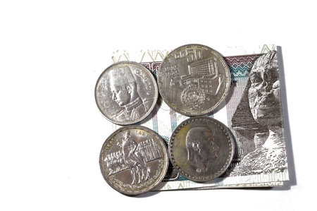 Egypt banknote with Egyptian silver coins of Orabi revolution, President Gamal Abdel Nasser, king Farouk I and the golden Jubilee of the Arab league, old vintage retro silver coins on 100 LE EGP pound