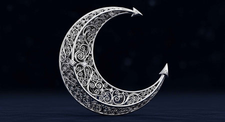 A detailed, crescent moon shape filled with ornate, swirling patterns on a dark background.
