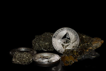 three silver ether coins from ethereum currency and minerals with iron on black background