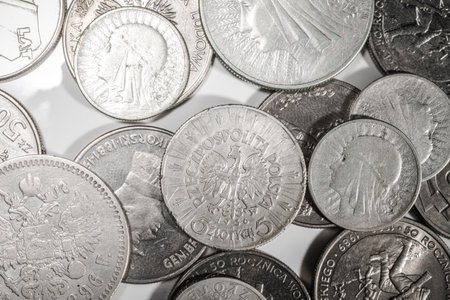 Various Polish coins lie on a reflective surface, showing intricate designs and historical symbols.