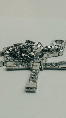 Silver christian cross necklace isolated on white. Cross of silver on a chain.