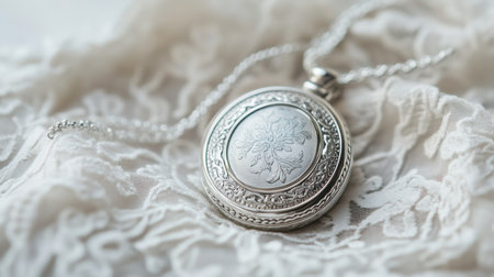 This exquisite silver locket necklace rests gracefully on soft lace fabric, showcasing its vintage charm and delicate texture, perfect for jewelry lovers.
