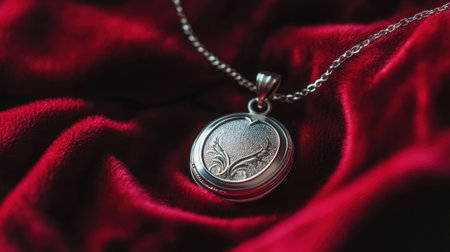 This captivating image features an elegant silver locket pendant resting on rich red velvet fabric, beautifully illuminated by soft natural light, emphasizing its intricate design.