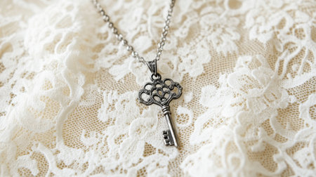A stunning vintage silver key pendant necklace rests on a delicate lace background, showcasing intricate details and elegance for jewelry lovers.