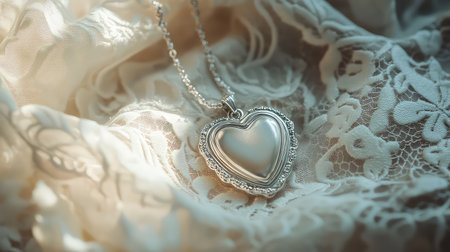 A stunning silver heart necklace rests gracefully on delicate lace fabric, embodying elegance and romance. Perfect for jewelry photography and gift ideas.