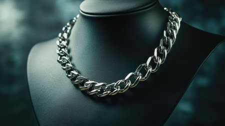 This captivating image features a sleek silver chain necklace showcased on a black bust. The elegant design and soft background highlight the necklace's beauty and craftsmanship, making it ideal for fashion and jewelry presentations.