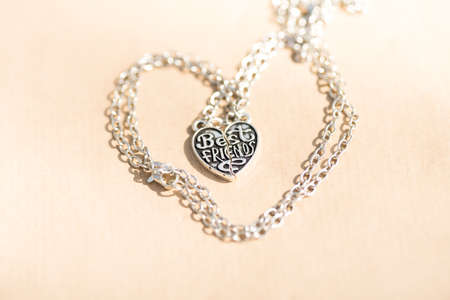Pendant Best Friend heart necklace shoot outside in a summer day closeup. Selective Focus