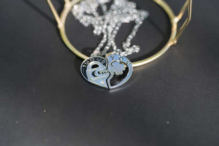 Couple set pendant necklace half of heart shoot outdoors in a sunny day closeup. Selective focus