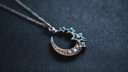 Close-up view of an elegant silver necklace showcasing a crescent moon with stars, adorned with green emerald accents on a dark background.