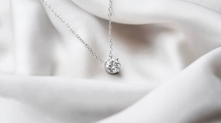 This image showcases an elegant silver necklace featuring a sparkling diamond, delicately laid on soft satin fabric, epitomizing luxury and sophistication.