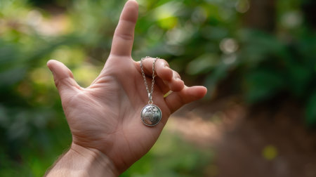 A close-up view of a hand holding a silver pendant with intricate detail, surrounded by vibrant green foliage, capturing the beauty of nature.