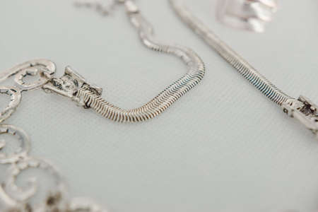 Necklace chain on white background, selective focus, macro