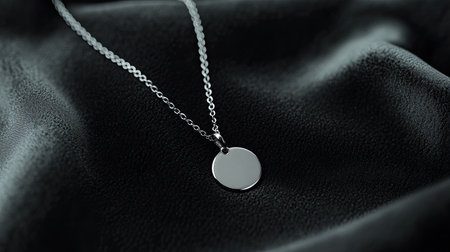 This stunning stock photo showcases an elegant silver necklace with a circular pendant, elegantly displayed on a vibrant fabric background. The rich colors and textures highlight the beauty of the jewelry, perfect for fashion-related projects.
