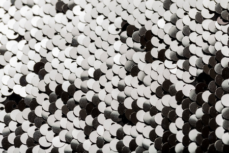 Shiny metallic sequins fabric. Black and silver two-sided sequins with blurred background background. Glowing sparkle texture. Bright brilliant backdrop. Fashion glamour textured circle scales