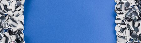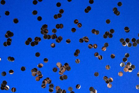 Festive silver confetti scattered on blue background. Flat lay style. Holiday concept. Pastel polka dots texture.