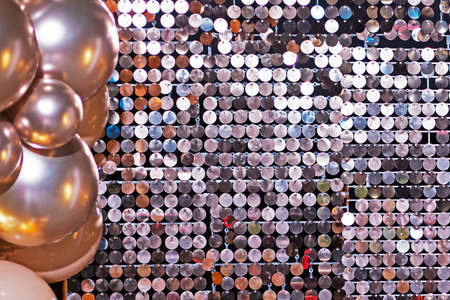 A sparkling silver backdrop made of hanging sequins glistens under bright lights, adding a festive touch to any event. The shiny material catches reflections as guests mingle in a joyful atmosphere