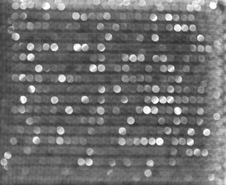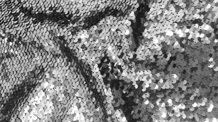 Sequin fabric. Black sequins with white and gray sheen. Reflection of light on individual elements in a chaotic manner. Sewing or Christmas decorative background.