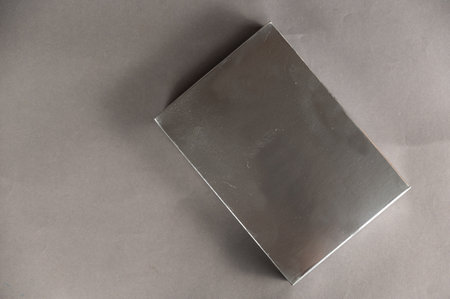 A silver rectangular box against a gray background. Copy space for text and design elements. selective focus.