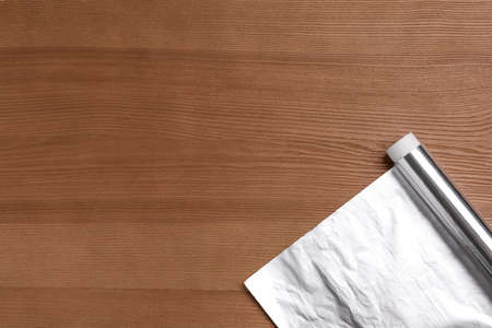 Roll of aluminum foil on wooden table, top view. Space for text