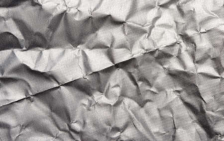 Crumpled aluminum foil texture. Sheet of creased silver foil with shiny folds for background. Metal wrinkled surface as graphic resource. Top view.